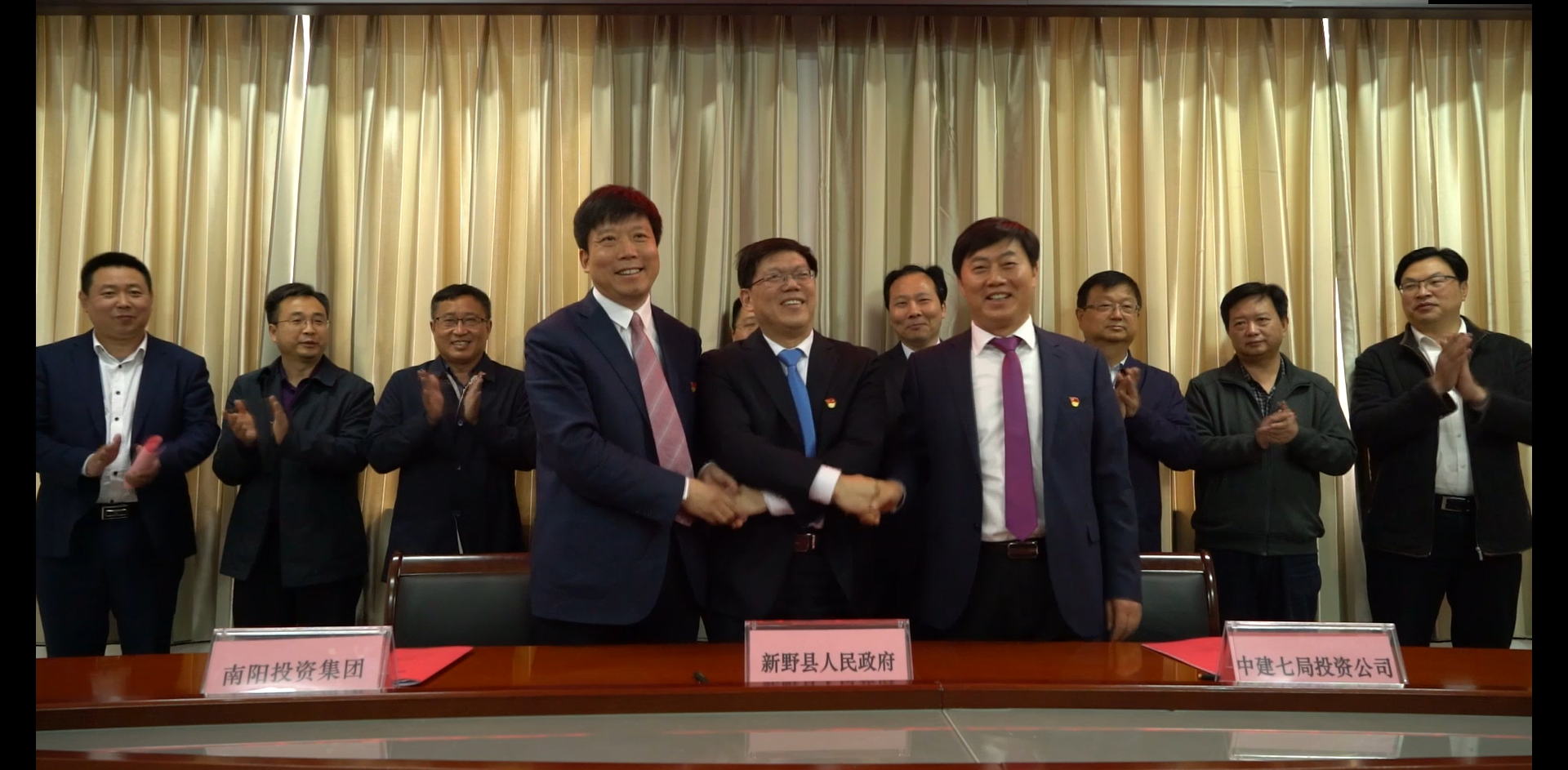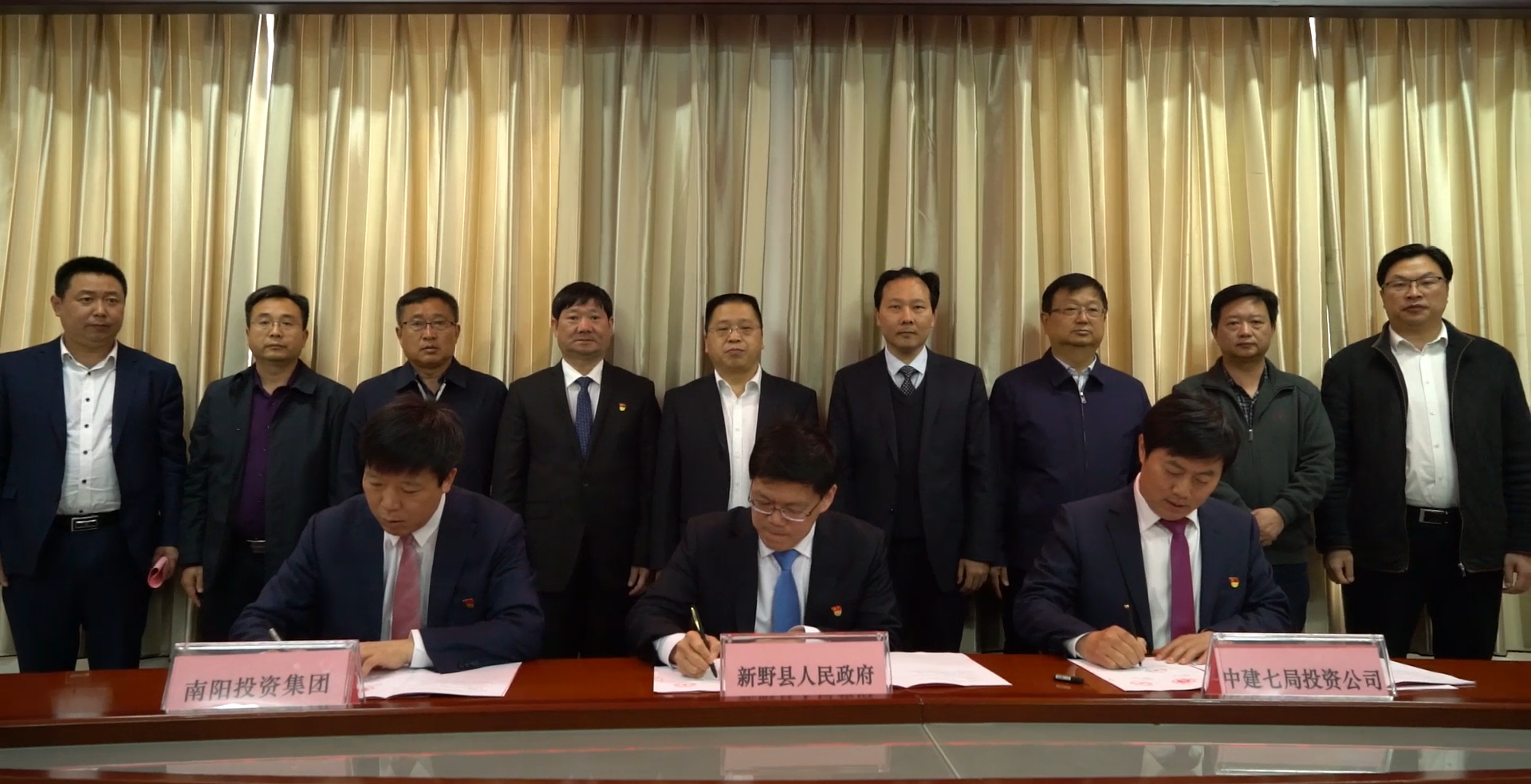 4月9日上午,新野縣河西新城區(qū)開發(fā)戰(zhàn)略合作簽約儀式在南陽投資集團舉行,新野縣委副書記、縣長趙紅亮、南陽投資集團黨委書記、董事長楊振中、中建七局投資公司黨委書記、董事長肖俊生分別代表三方致辭并簽約。中建七局黨委常委、財務總監(jiān)鮑宗平、新野縣委常委、副縣長姜濤、副縣長李中陽、南陽投資集團黨委委員、總經(jīng)理高增偉、黨委委員、副總經(jīng)理趙慶、財務總監(jiān)王克及三方相關人員、單位參加簽約儀式。