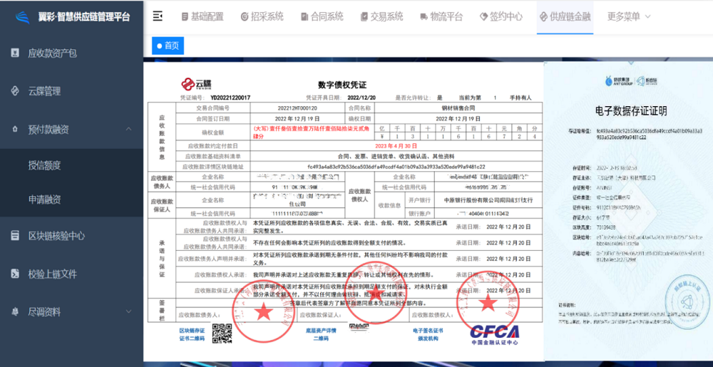 “云牒”是以信用為核心、以債權(quán)為實(shí)質(zhì)的新型數(shù)字化憑證,在供應(yīng)鏈金融平臺(tái)中具有債權(quán)多級(jí)流轉(zhuǎn)、無限拆分、不可篡改、申請(qǐng)融資等諸多特點(diǎn)。通過供應(yīng)鏈金融平臺(tái)的運(yùn)營(yíng),不但可以打通企業(yè)、產(chǎn)業(yè)與銀行、證券、商業(yè)保理、融資擔(dān)保等金融機(jī)構(gòu)之間的合作關(guān)系,同時(shí)極大的豐富了企業(yè)支付策略、融資策略、合作策略,從而推動(dòng)商業(yè)模式的創(chuàng)新,有效解決中小微企業(yè)融資難、融資貴、融資慢等問題,真正實(shí)現(xiàn)“電子債權(quán)憑證,信用鏈?zhǔn)絺鬟f,服務(wù)實(shí)體企業(yè),創(chuàng)造社會(huì)價(jià)值”。