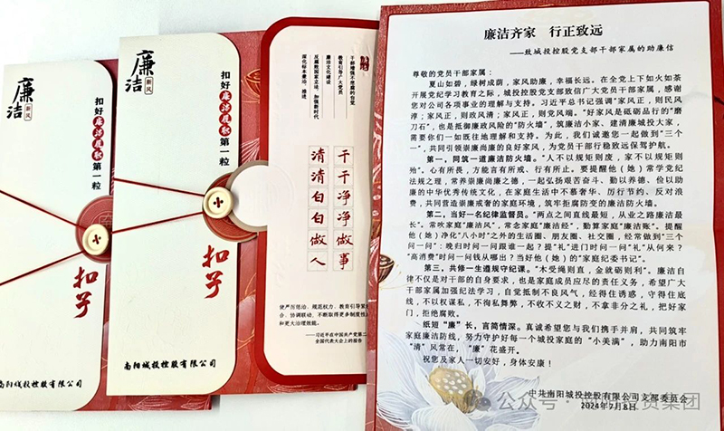 為深入貫徹落實習(xí)近平總書記關(guān)于注重家庭家教家風(fēng)建設(shè)的重要論述,充分發(fā)揮家庭家教家風(fēng)在推進(jìn)新時代廉潔文化建設(shè)中的重要作用,城投控股黨支部結(jié)合集團黨委統(tǒng)一安排,開展“清風(fēng)寄語家書話廉”活動。支部為全體黨員干部及家屬準(zhǔn)備了助廉信,提醒黨員干部及其家庭成員共同筑牢家庭廉潔防線,努力守護好每一個城投家庭的“小美滿”,助力南陽市“清”風(fēng)常在,“廉”花盛開。同時積極動員黨員干部圍繞“家風(fēng)傳承類、親子教育類、夫妻共勉類、個人感悟類”為主題書寫廉潔家書,傳承以德立家、以廉齊家、以儉興家的優(yōu)良傳統(tǒng)。