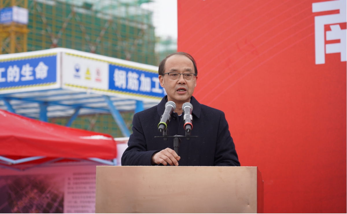 劉九利在致辭中表示,南陽智慧物聯(lián)職業(yè)學(xué)院項(xiàng)目主體結(jié)構(gòu)的順利封頂離不開市委、市政府領(lǐng)導(dǎo)的關(guān)心重視,離不開市直各單位和城鄉(xiāng)一體化示范區(qū)管委會的支持配合,更離不開各參建單位“春節(jié)不斷檔、節(jié)目不停工”的日夜奮戰(zhàn)。他代表南陽投資集團(tuán)對所有參與項(xiàng)目建設(shè)的全體同志表示深深地感謝和慰問。