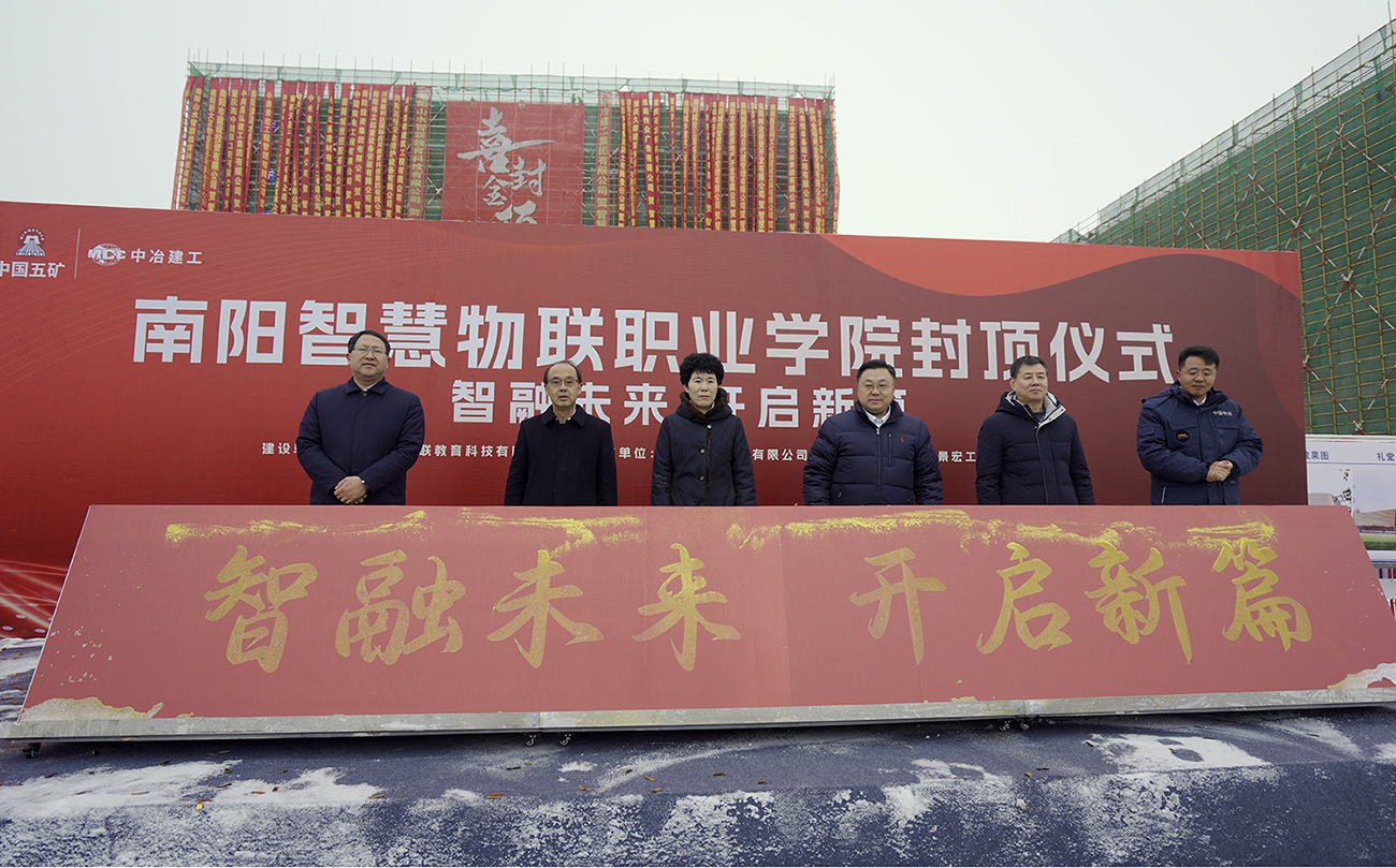 封頂儀式上,各位領(lǐng)導(dǎo)共同澆筑鎏金沙,隨著金沙緩緩流下,“智融未來,開啟新篇”八個大字燦然而現(xiàn),粒粒金沙寓意著南陽智慧物聯(lián)職業(yè)學(xué)院的美好未來。