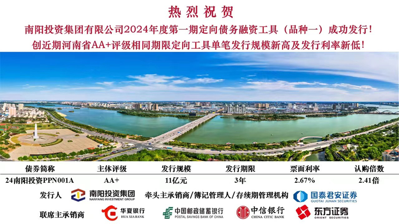 10月25日,南陽投資集團2024年第一期定向融資工具(24南投集團PPN001)成功發(fā)行,金額11億元,期限3年,票面利率2.67%,全場倍數(shù)2.41倍,聯(lián)席主承銷商為國泰君安證券、東方證券、中信銀行、郵儲銀行、華夏銀行,創(chuàng)近期河南省AA+評級相同期限定向工具單筆發(fā)行規(guī)模新高及發(fā)行利率新低!